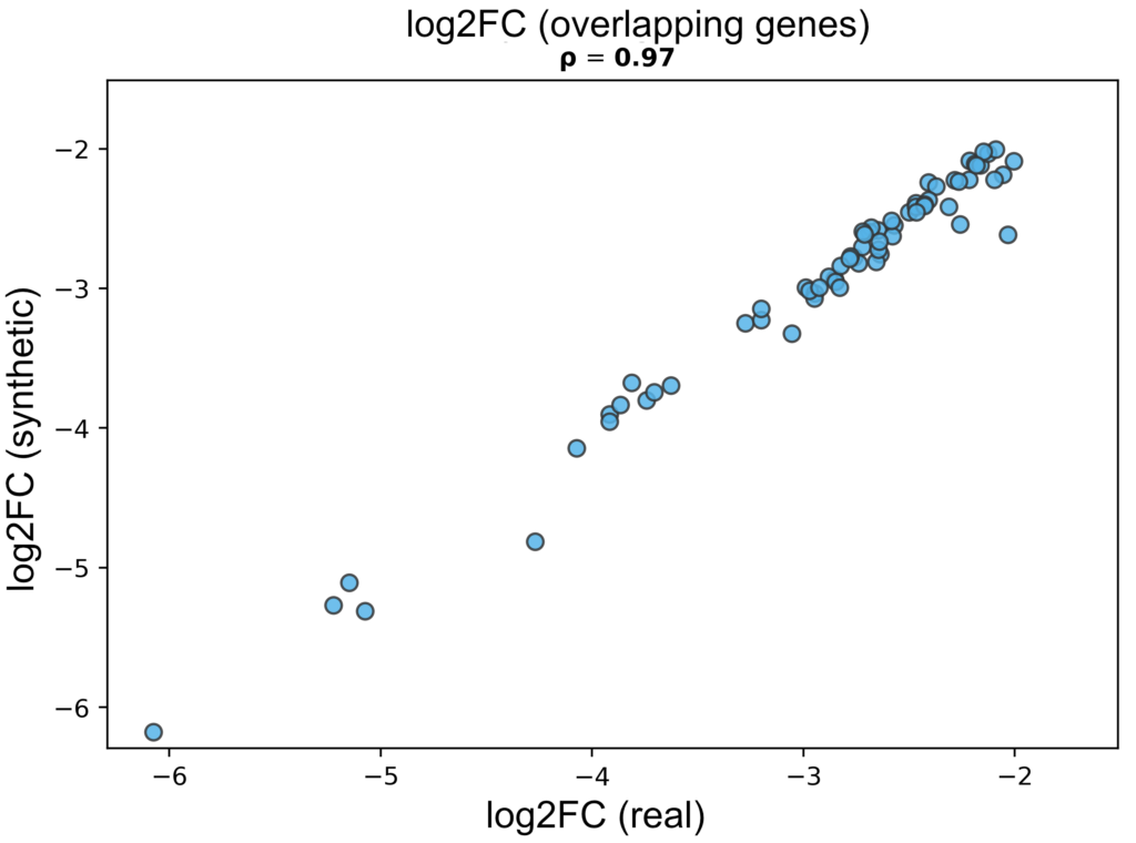 Figure 3: Gene-level log2 fold-changes on overlapping genes showing strong concordance between real and synthetic data (Spearman ρ = 0.97).