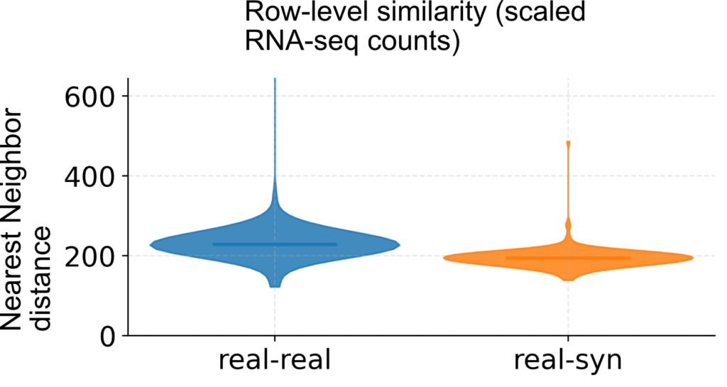 Violin plots show nearest-neighbor distances in scaled expression space for real–real and real–synthetic rows. Real–synthetic distances closely track real–real baselines, indicating that synthetic samples are not overfit/memorized versions of real transcriptomic rows.